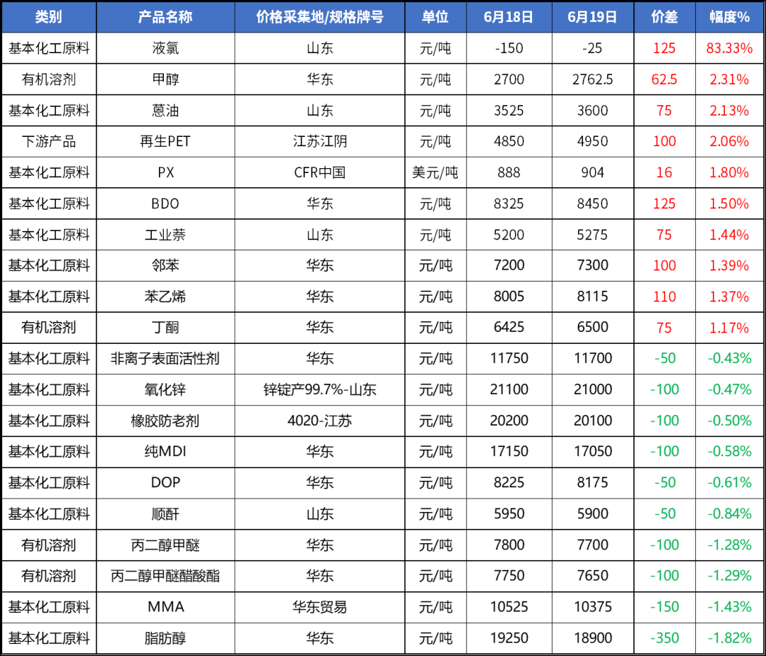 在卓创资讯(301299)监测的109个产品之中,本周期有39个产品上涨,占比83.33%;54个产品持稳,占比49.54%;16个产品下降,占比14.66%。上涨的前三名产品为液氯、甲醇、蒽油,涨幅分别83.33%、2.31%、2.13%;下跌前三名产品为脂肪醇、MMA、丙二醇甲醚醋酸酯,跌幅分别为1.82%、1.43%、1.29%。